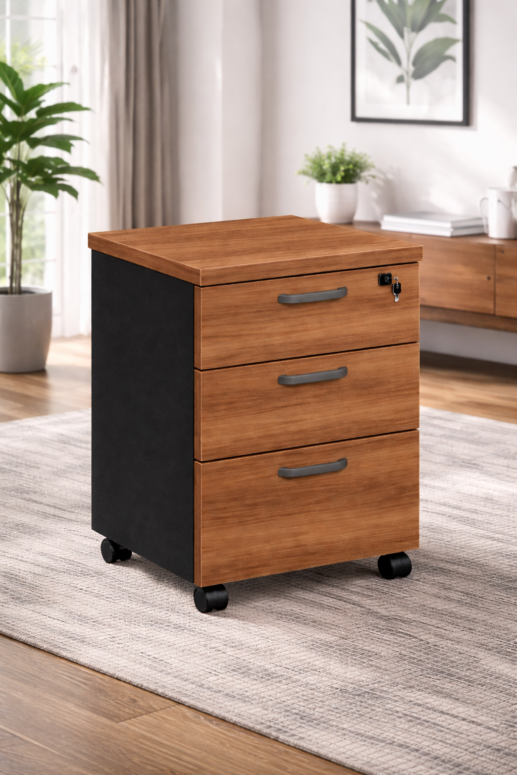 O Gaveteiro Volante com 3 Gavetas na cor Sevilha/Preto é a solução ideal para quem precisa de mais organização e praticidade no ambiente de trabalho. Compacto e funcional, ele é perfeito para ser utilizado ao lado ou embaixo de mesas de escritório, mantendo documentos e materiais sempre ao alcance.