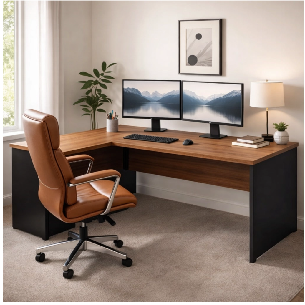 A Mesa em L com Mesa Auxiliar 1,50m na cor Sevilha/Preto é ideal para quem busca mais espaço, organização e praticidade no ambiente de trabalho. Seu formato em L permite aproveitar melhor o espaço do ambiente, sendo perfeita para escritórios, home office, empresas ou ambientes corporativos.