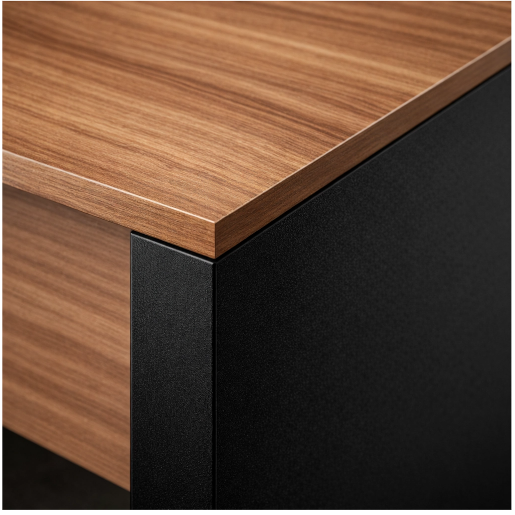 O acabamento na cor Sevilha com Preto traz um visual moderno, elegante e profissional, combinando facilmente com diversos estilos de decoração. Por não possuir gavetas, a mesa mantém um design mais limpo e funcional, além de oferecer maior liberdade de movimentação.