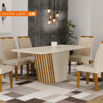 Sala de Jantar Liz 1,80m – Mesa 0,80m Alt. x 1,80m Comp. x 0,90m Larg. + Cadeiras Estofadas Modernas