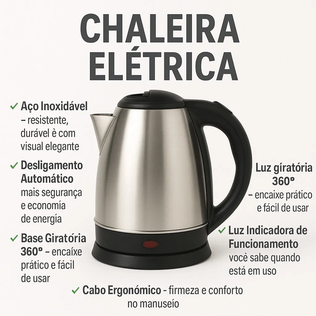Transforme sua rotina com a praticidade e eficiência da Chaleira Elétrica de Aço Inoxidável, ideal para quem busca agilidade no preparo de bebidas quentes e receitas diversas. Com capacidade de 2 litros e potência de 1000W, ela aquece a água rapidamente, economizando tempo no seu dia a dia.