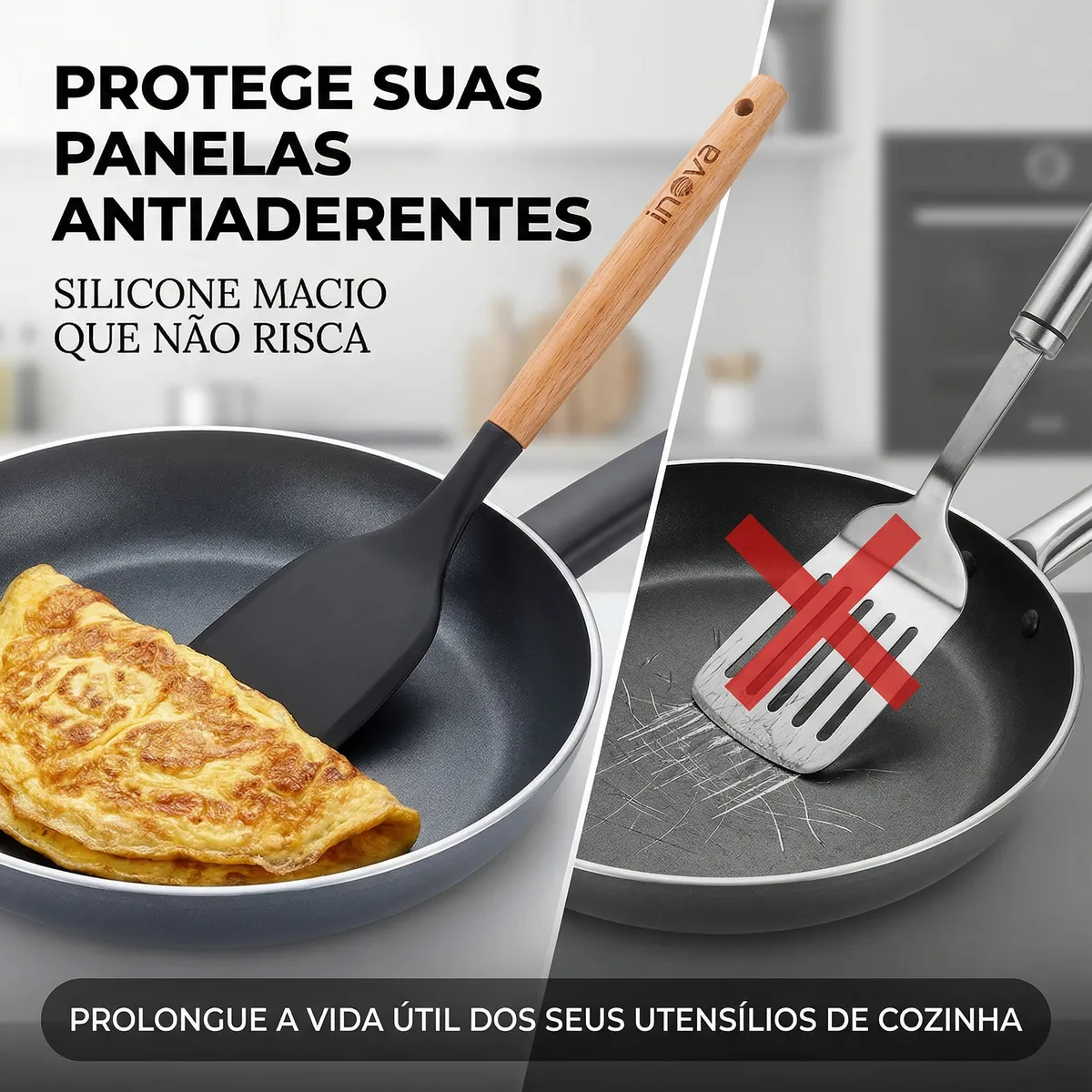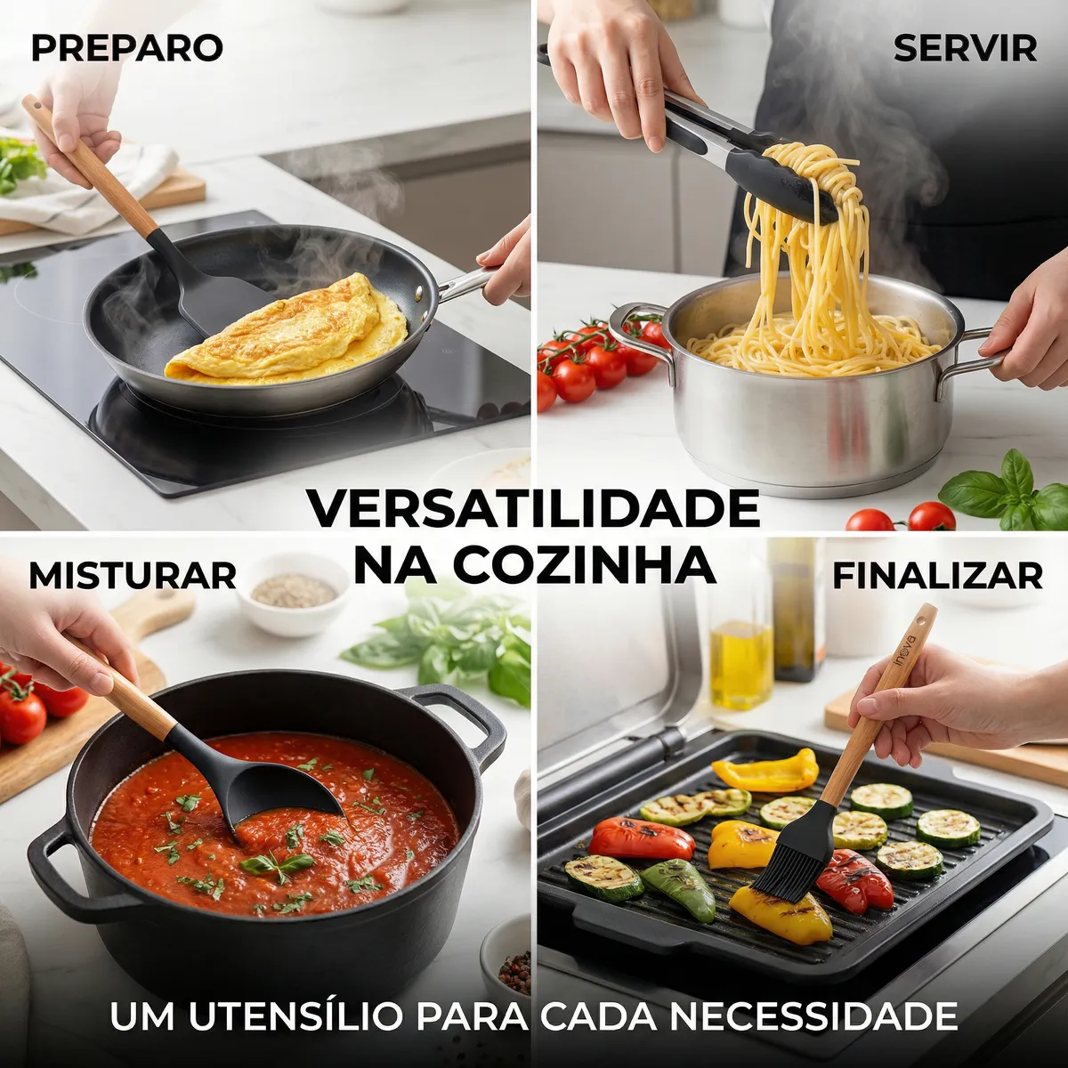 Sabe aquele conjunto de colheres lindo que você vê nos vídeos de receita? Agora ele pode ser seu! O Kit Inova 12 Peças une o design sofisticado da madeira com a praticidade do silicone, transformando sua bancada e protegendo suas panelas.