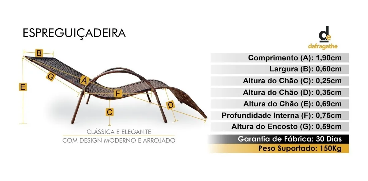 Com dimensões de 1,92 m de comprimento e 68 cm de largura, a espreguiçadeira suporta até 150 kg, tornando-se uma opção segura para diferentes usuários. Embora não seja dobrável, sua portabilidade permite fácil transporte, ideal para quem gosta de aproveitar diferentes ambientes. O apoio de braços oferece um toque extra de conforto, permitindo que você desfrute de longas horas de descanso.
