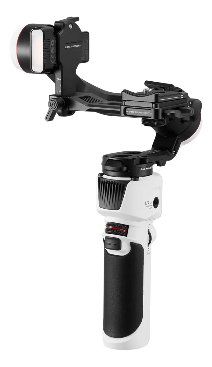 Um sistema de liberação rápida com duas formas de ajuste permite que você acesse facilmente a bateria da câmera sem precisar reequilibrar. Marcas de escala e travas ajudam você a balancear a câmera e travar a posição de equilíbrio. O Estabilizador Gimbal Crane-M3S também possui uma luz de preenchimento integrada com uma saída de 1000lux e temperatura de cor ajustável, trazendo ainda mais praticidade e liberdade para as suas gravações.
