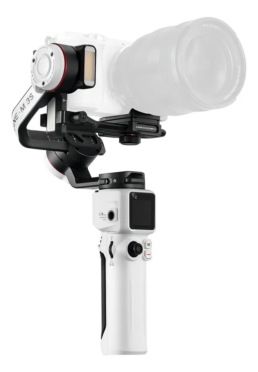 Com design redesenhado, o Zhiyun Crane-M3 S oferece um sistema de suporte otimizado que expande a compatibilidade de câmeras e lentes. Você ainda pode usar seu Smartphone ou Câmera de Ação com adaptadores de montagem (disponíveis separadamente), mas se estiver buscando qualidade de vídeo profissional, Câmeras Mirrorless com lentes full-frame também podem ser montadas no gimbal. O Gimbal Crane-M3 S é capaz de suportar câmeras como Sony a7S III, Nikon Zfc, Canon EOS M50 Mark II e Canon EOS 200D, todas com lentes full-frame acopladas.