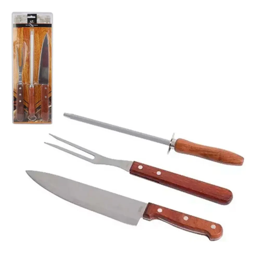 Jogo Churrasco Wood 3 Peças – Faca, Garfo e Chaira