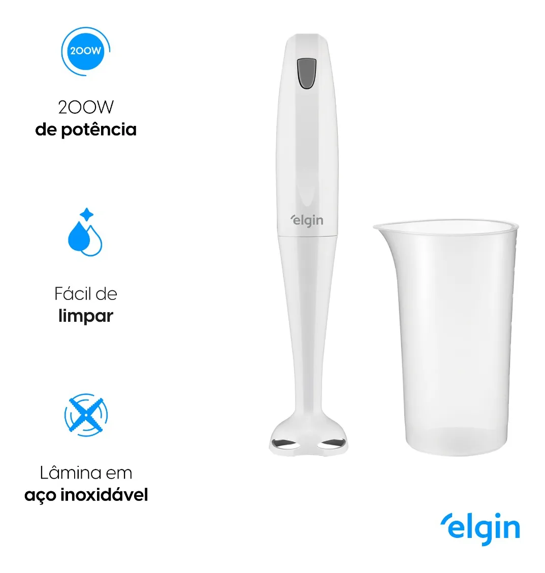 O Mixer de Mão Elgin tem um design compacto e ergonômico, ideal para preparo rápido de caldos, sucos, shakes, mistura de massas leves e bater ovos, entre outras receitas. Acompanha copo para mistura.