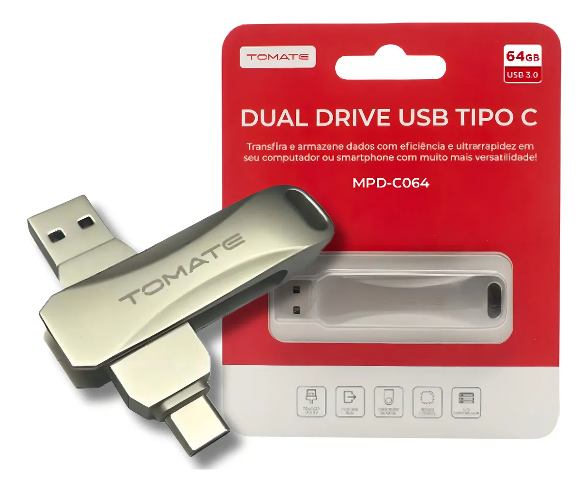 Pen Drive 2 em 1 Dual Drive USB-A e USB-C de 64GB Tomate