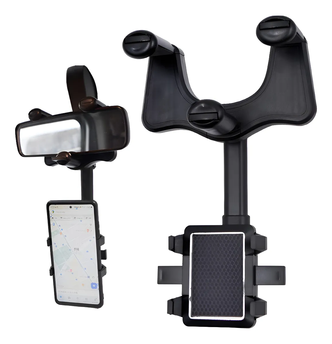 Suporte multifuncional para telefone para espelho retrovisor. Use seu smartphone com segurança no espelho retrovisor. Este suporte de telefone prenderá seu telefone com segurança com confiança e sem dificuldades. Fácil de instalar, extensível e com rotação 360º, para atender às necessidades de diferentes linhas de visão. O celular pode ser fixado na posição vertical e horizontal, não cai na trepidação nas ruas desde que encaixe-o bem, deixando bem fixado.